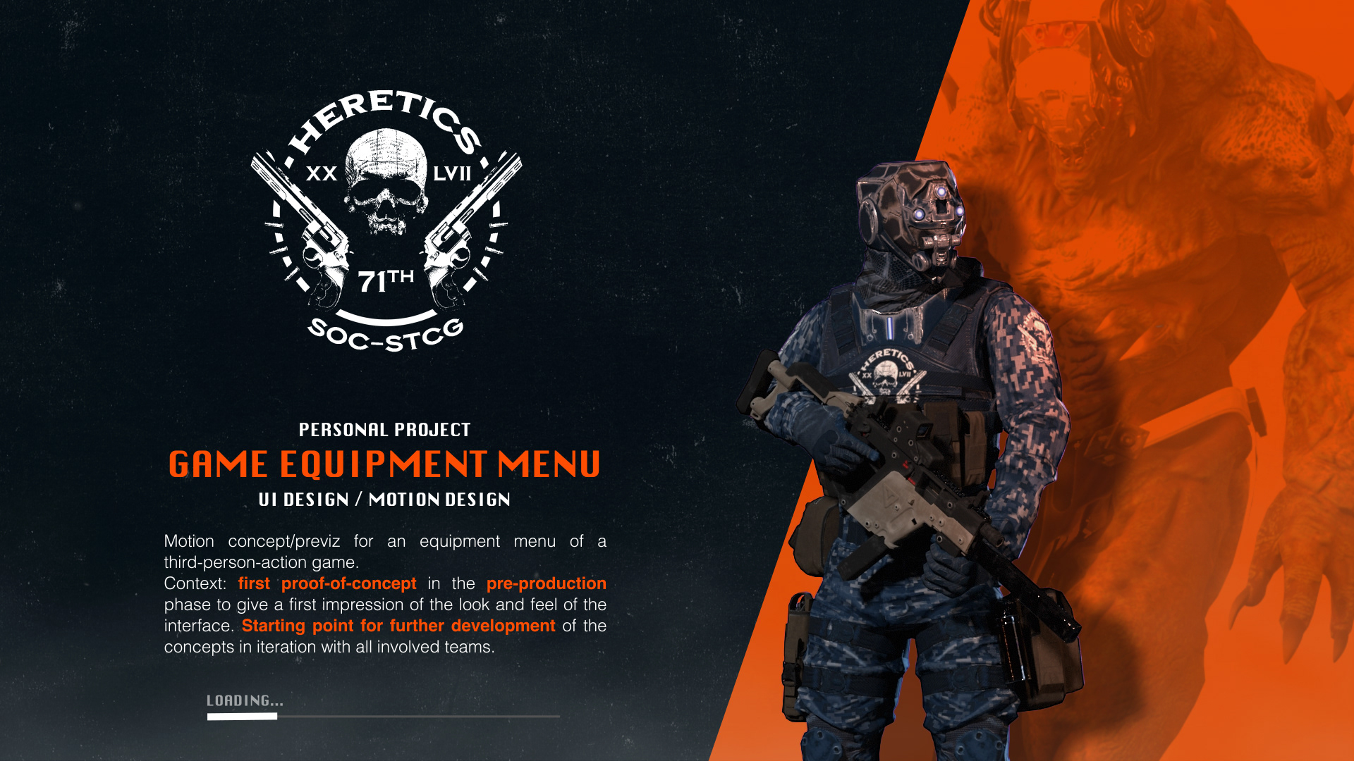 Motion concept/previz for an equipment menu of a third-person-action game. Context: first proof-of-concept in the pre-production phase to give a first impression of the look and feel of the interface. Starting point for further development of the concepts in iteration with all involved teams.